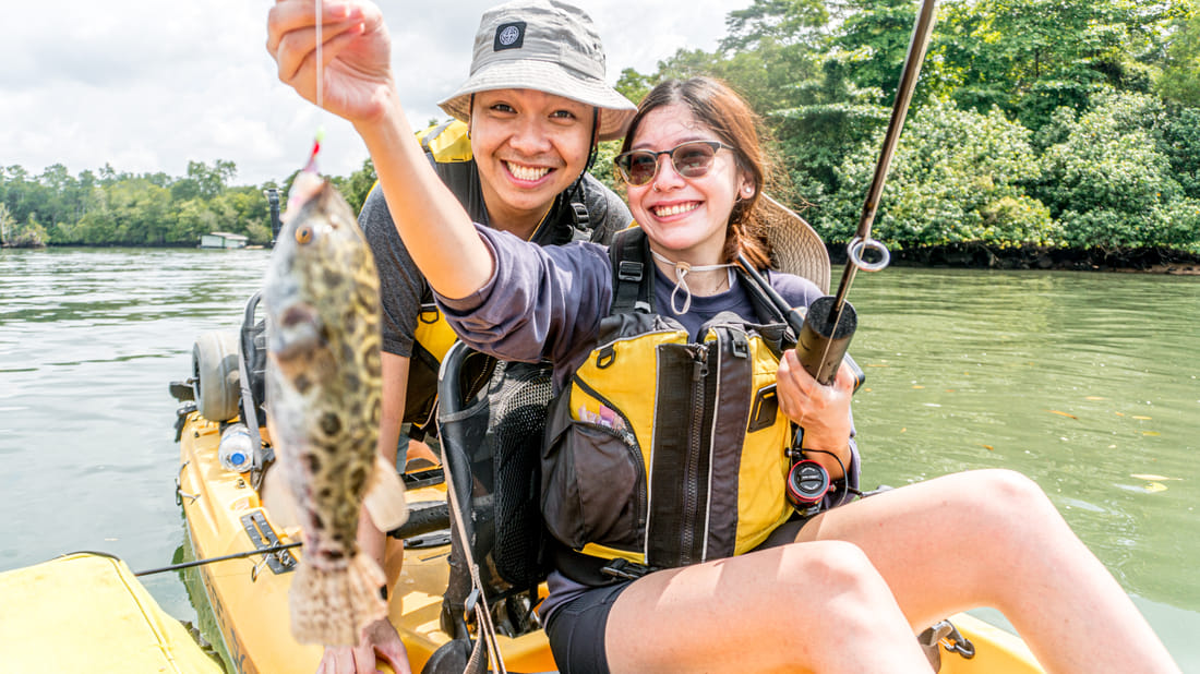 Along the way, you'll pass Singapore’s last remaining floating villages and fish farms, or “Kelongs,” where you can also fish around sunken structures for a variety of bottom fish. And if luck is on your side, local Kelong residents might even invite you up for a cup of tea!
